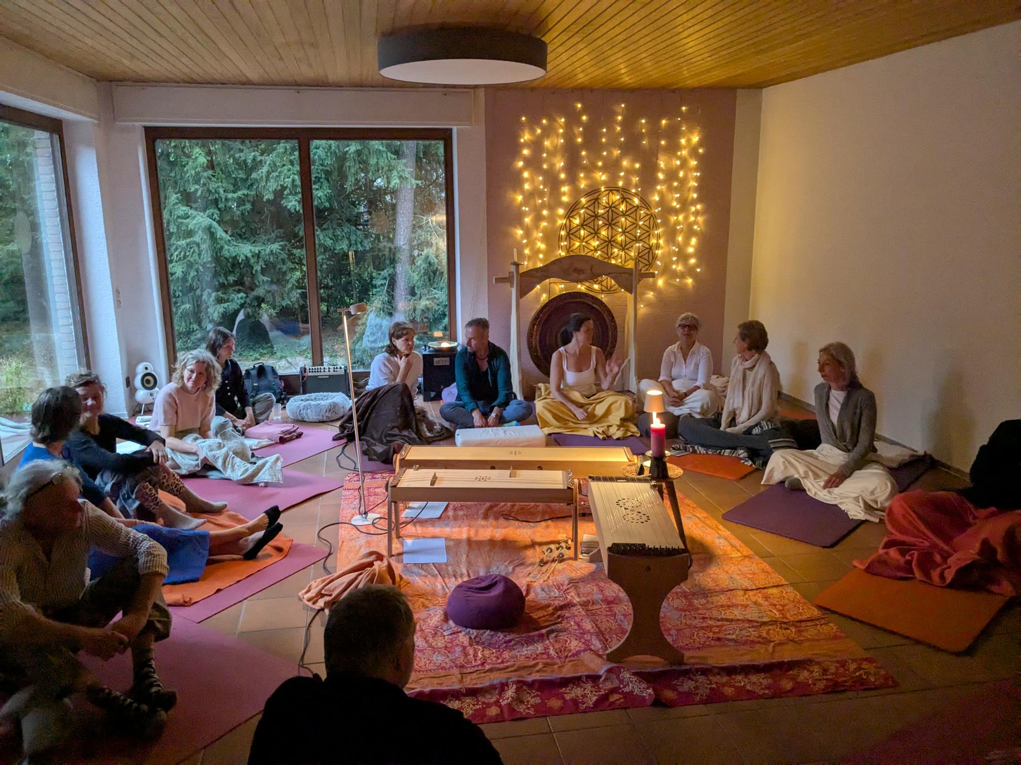 We also occasionally offer sound concerts using instruments from our workshop, where we play different instruments simultaneously. The visitors lie on the floor throughout the room, while we play live on our instruments for 45 to 60 minutes. The powerful and intense soundscapes allow the listeners to experience deep inner peace, joy, and connection.