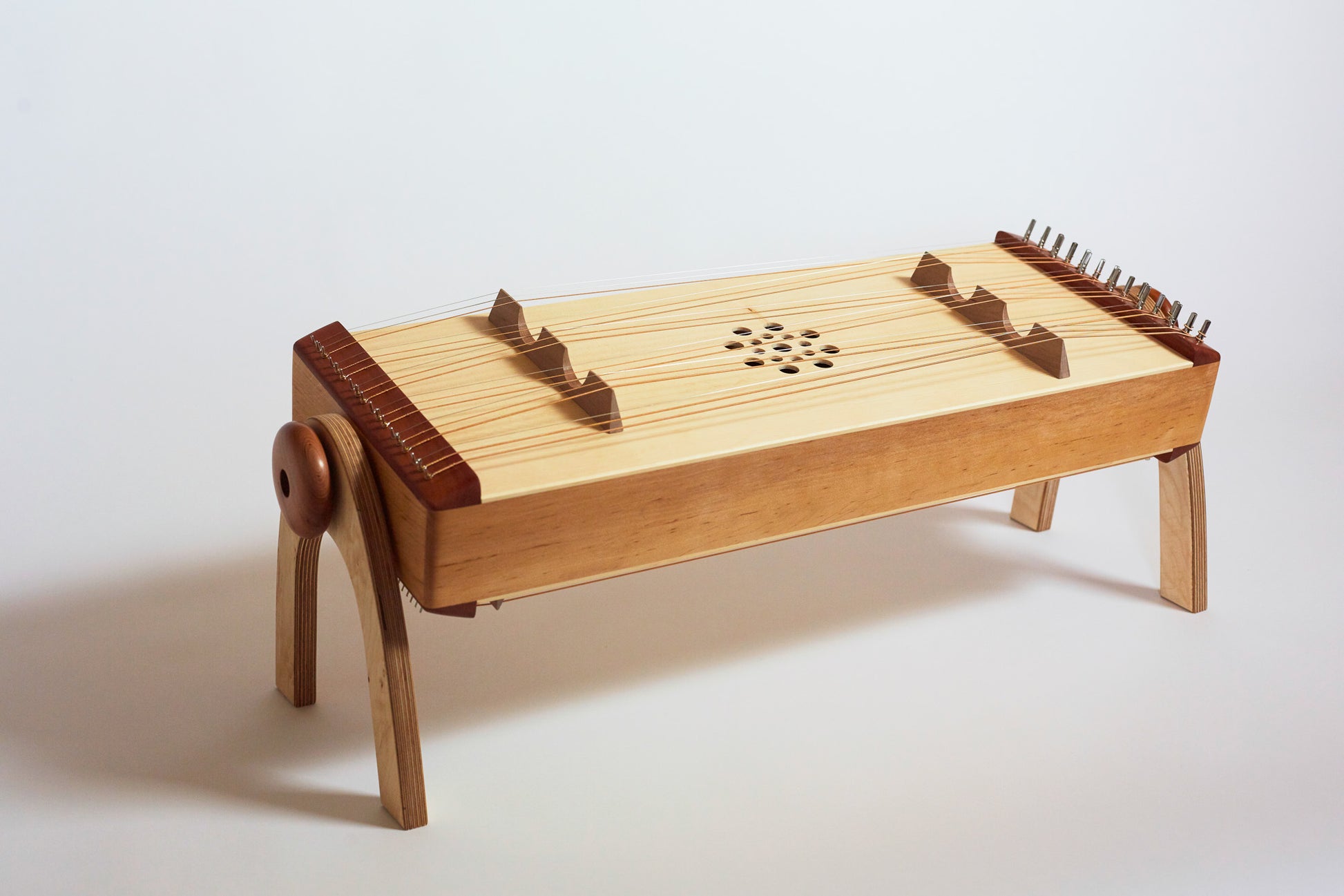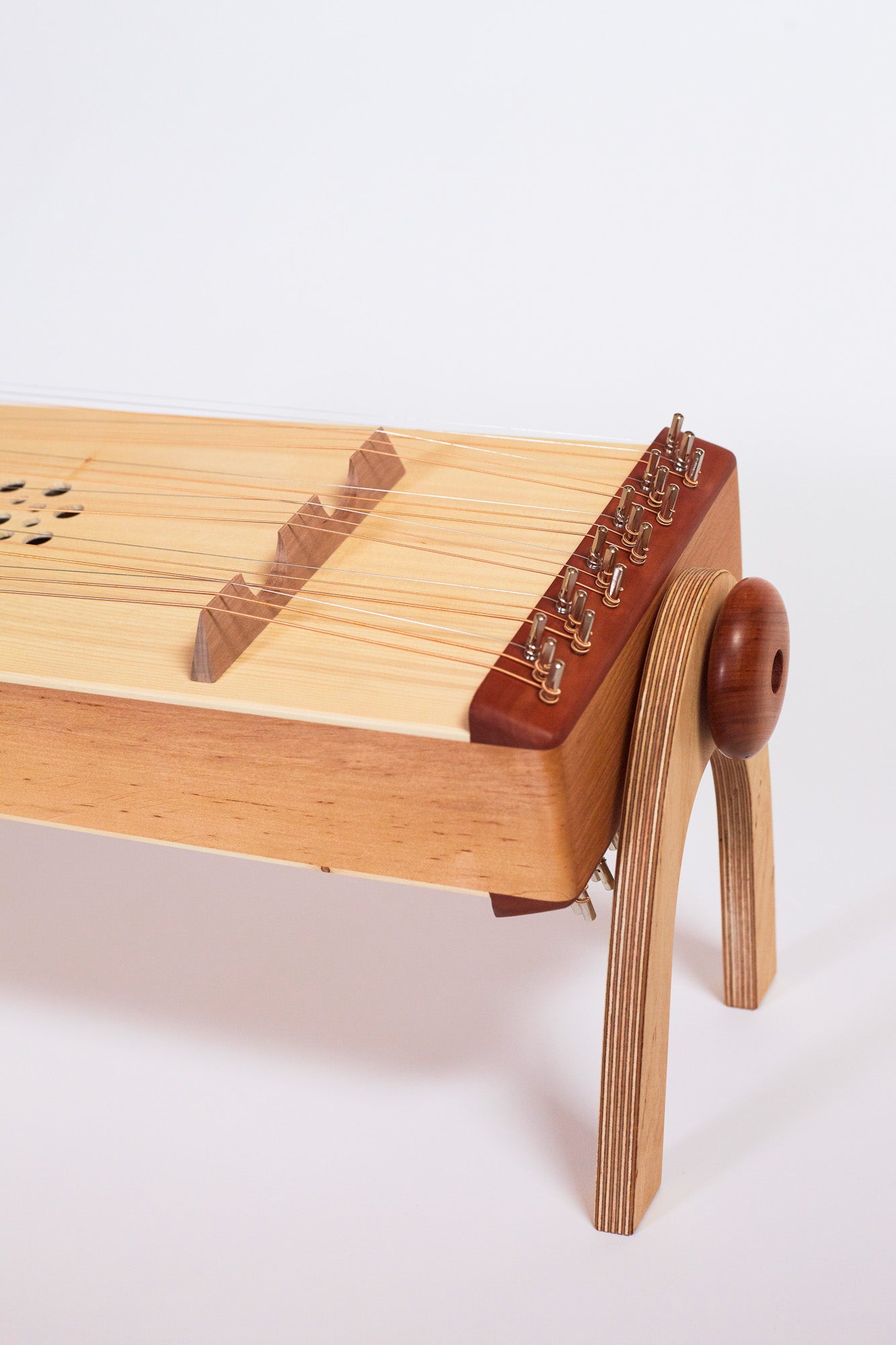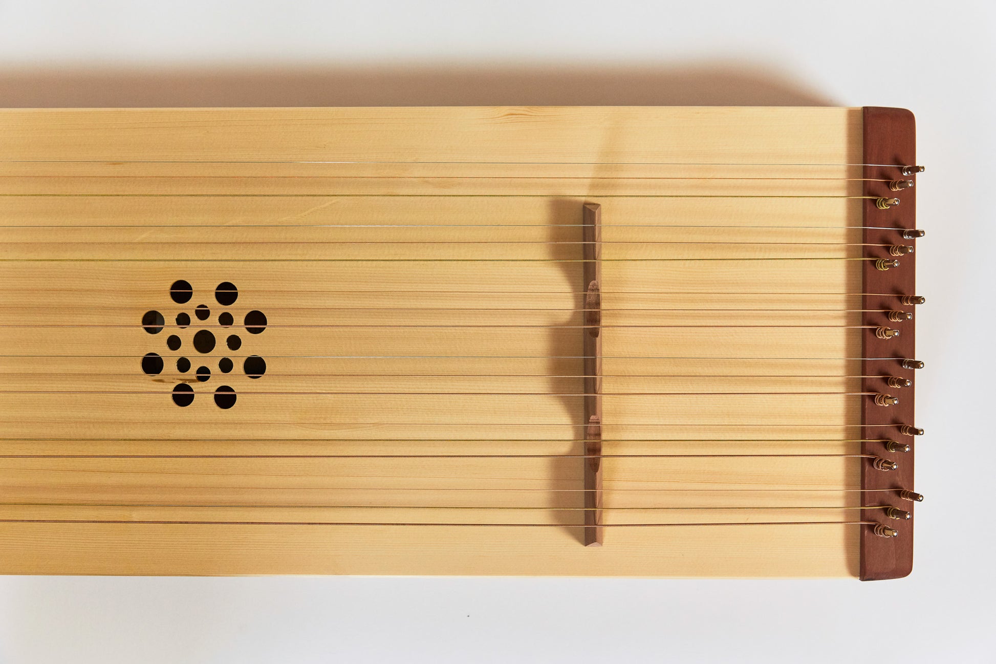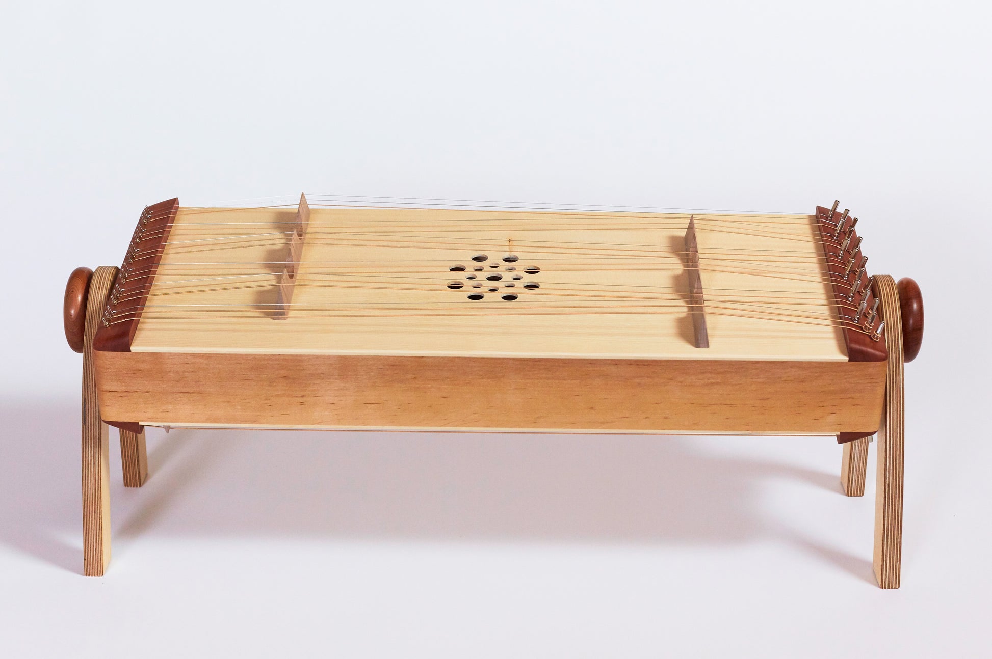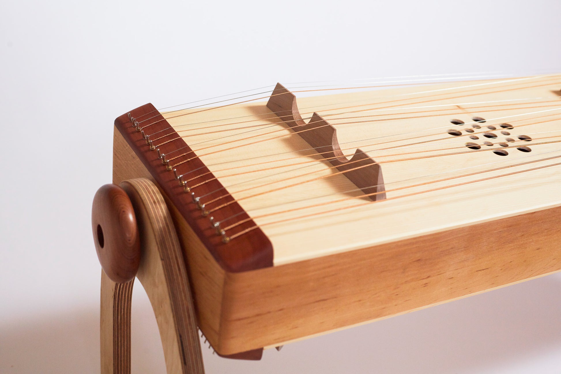 The song harp is a plucked instrument with 17 strings in diatonic tuning. It is a table or lap harp where you can put pre-made music sheets under the strings. If you follow the course of the notes and pluck the strings above, you can play simple songs effortlessly, similar to the zither, which had music sheets to put underneath, or the fairy harp.